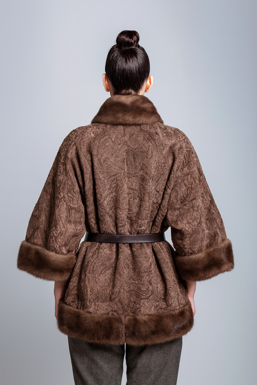 Жакет из каракуля коричневого цвета с отделкой из норки и поясом. Авторский дизайн.
