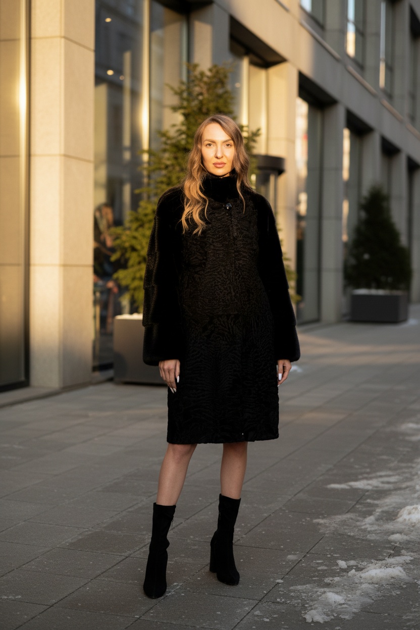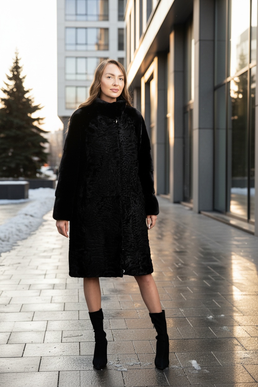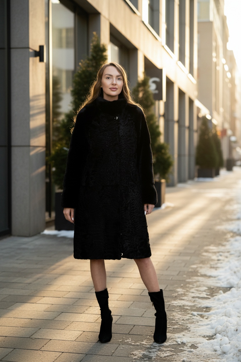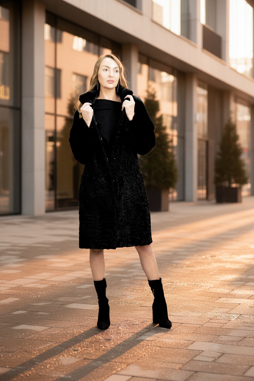 Каракулевая шуба в стиле Афган. Тонкий завиток свакара, контрастная отделка, приталенный силуэт.