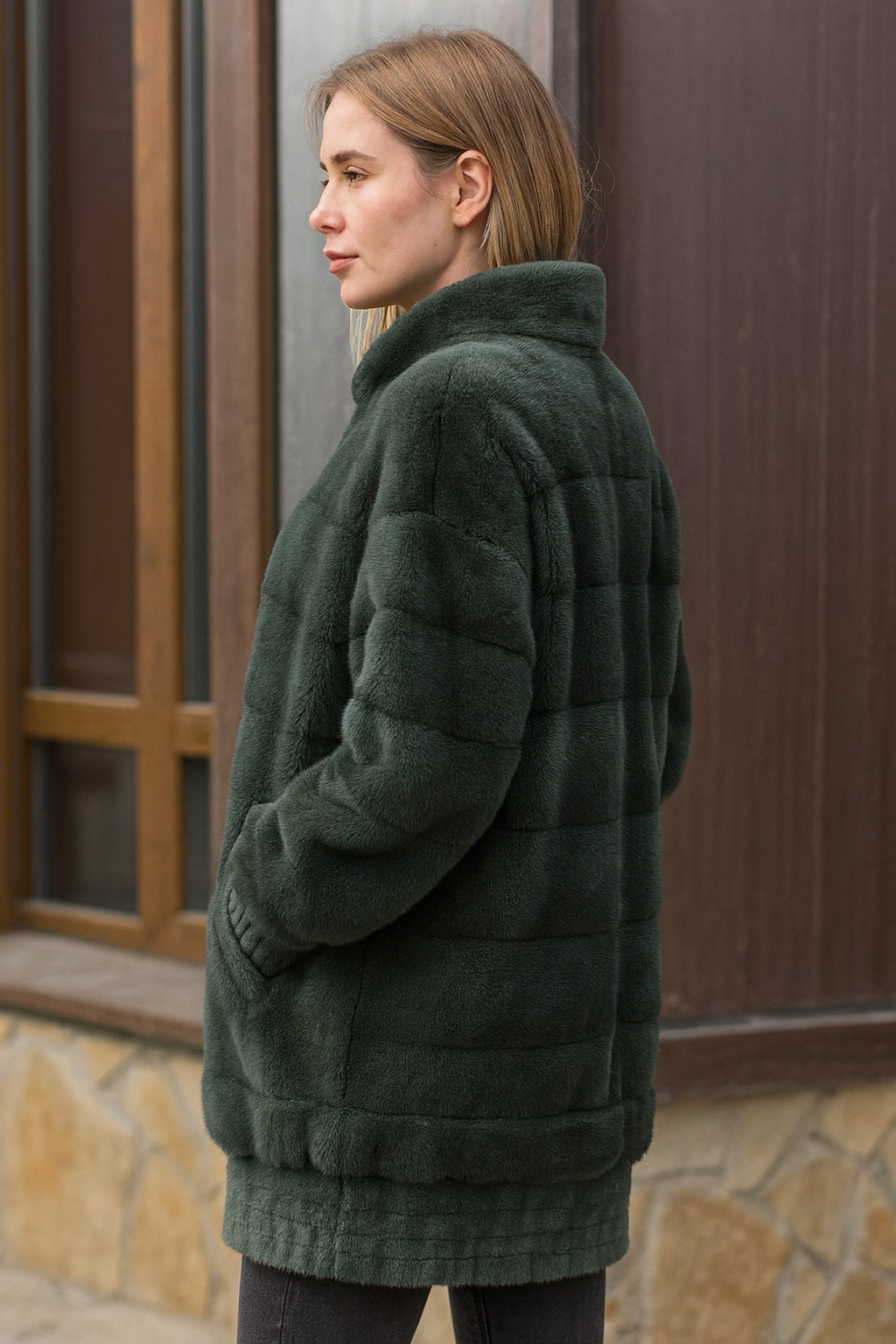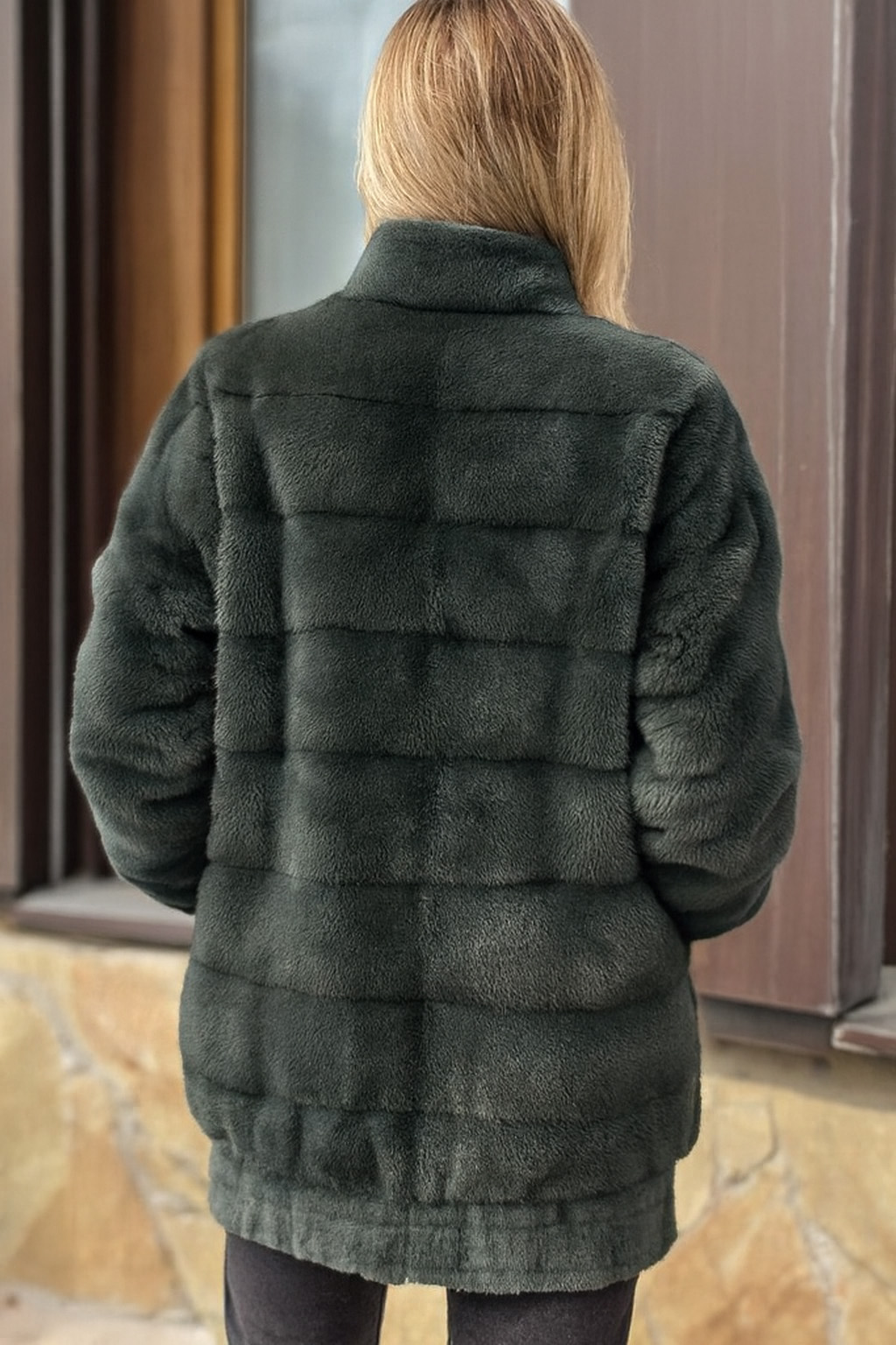 Меховая куртка насыщенного тёмно-зелёного цвета. На молнии, спортивный шик.