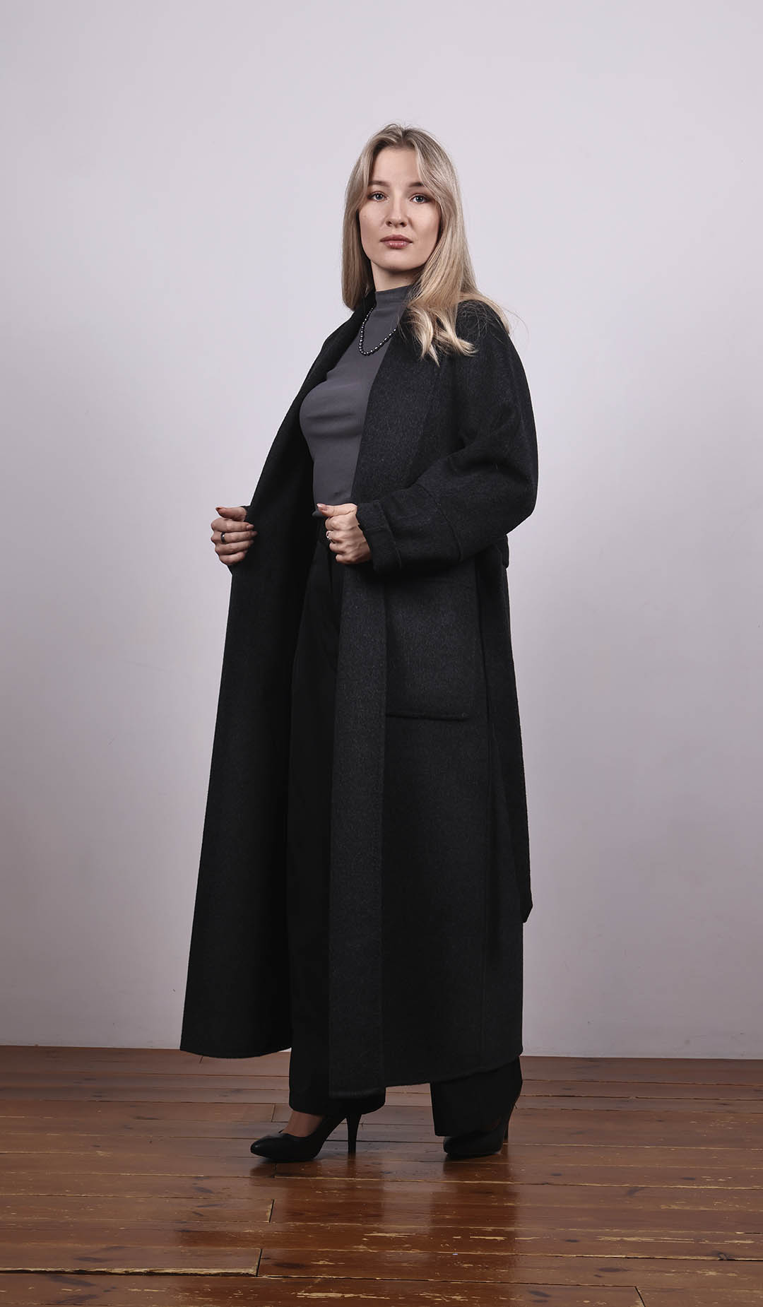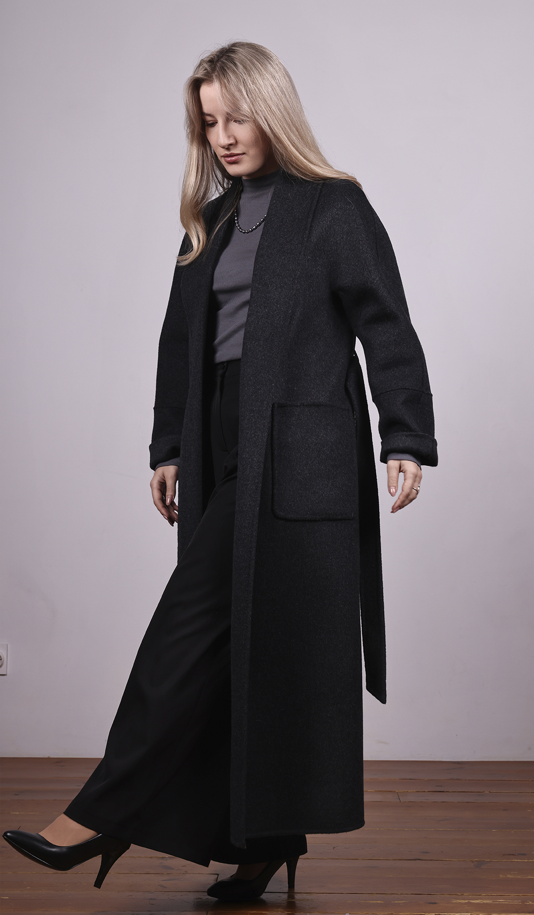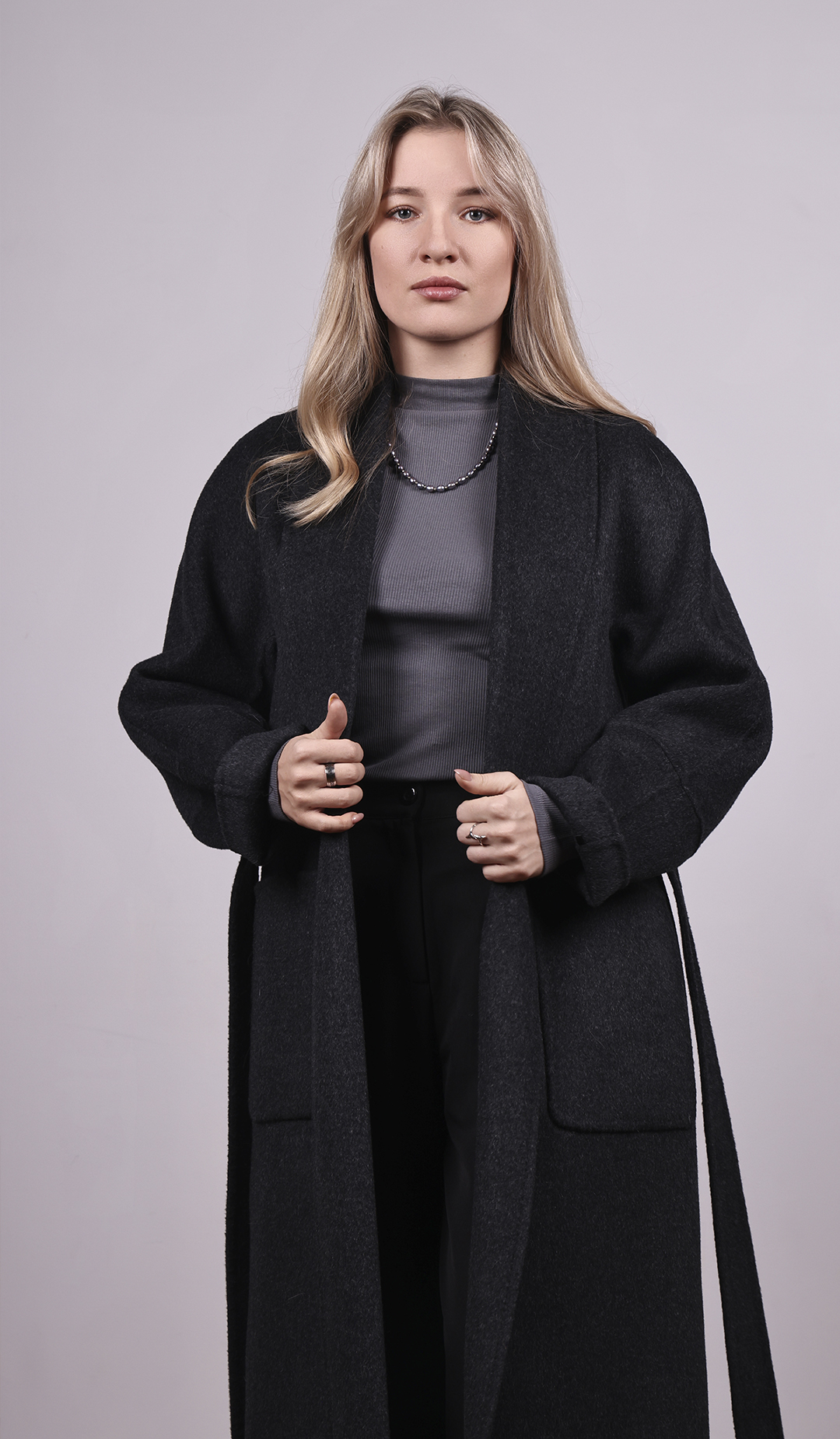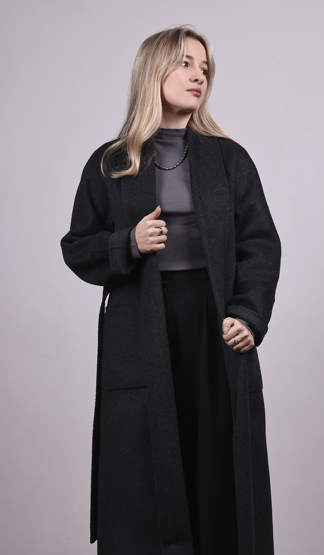 Длинное пальто из тёмной шерсти. Прямой силуэт с поясом. Лаконичный и строгий стиль.