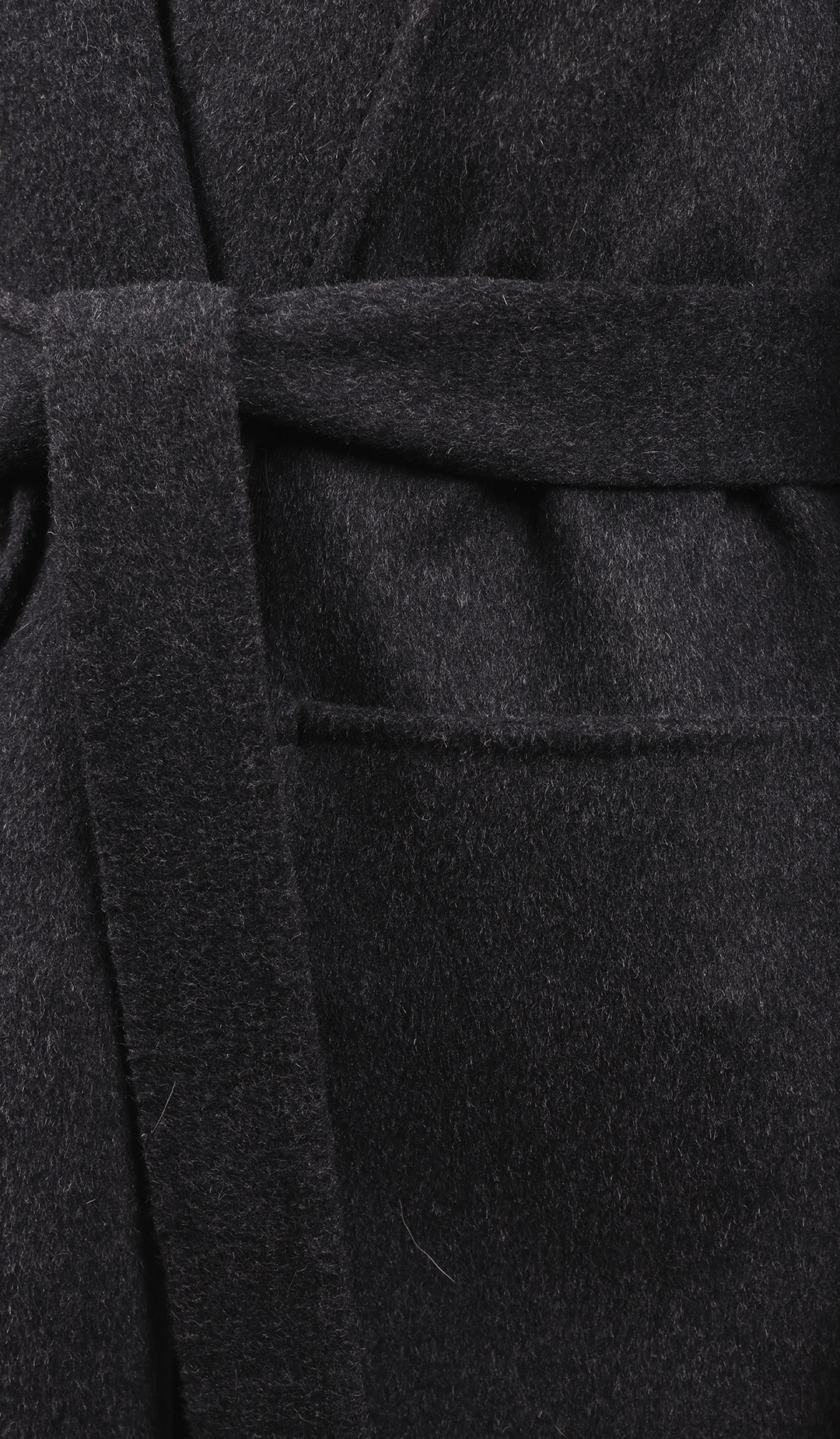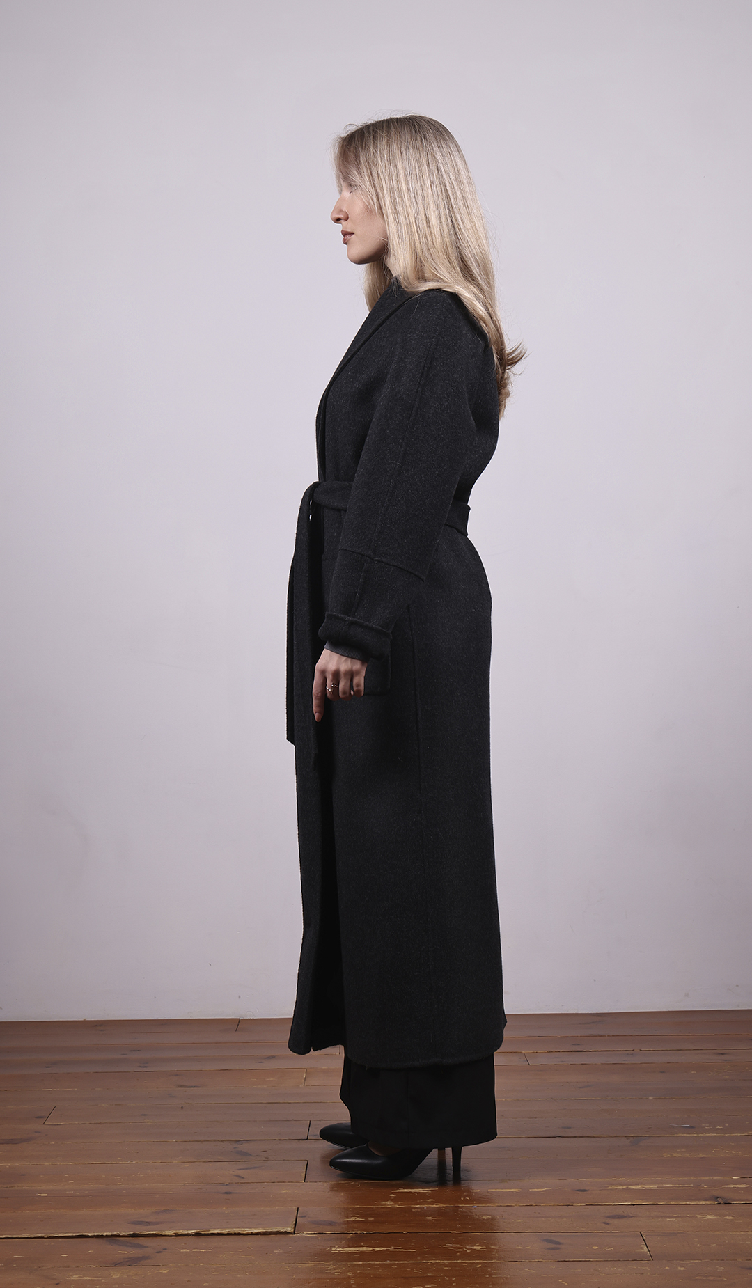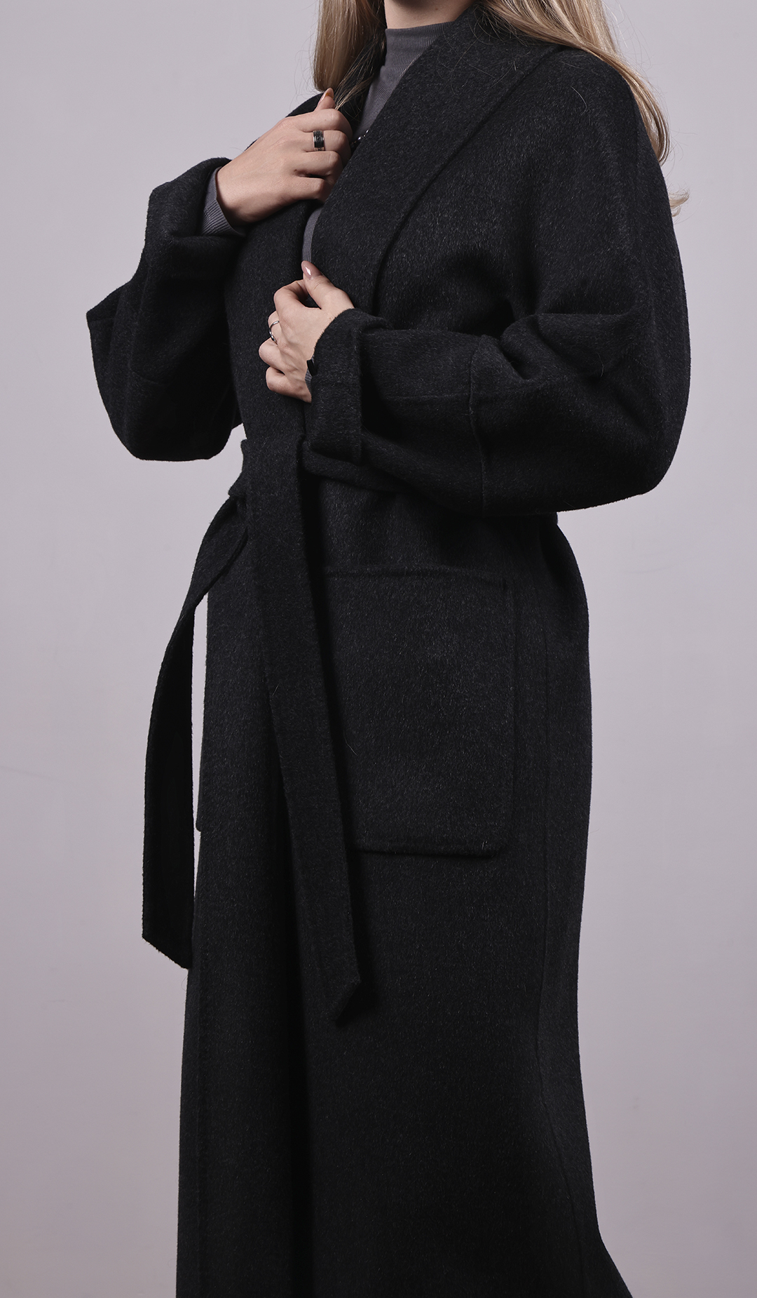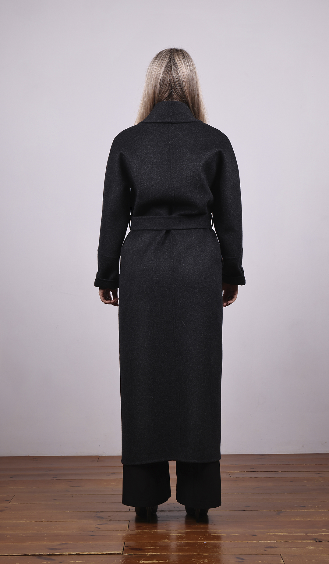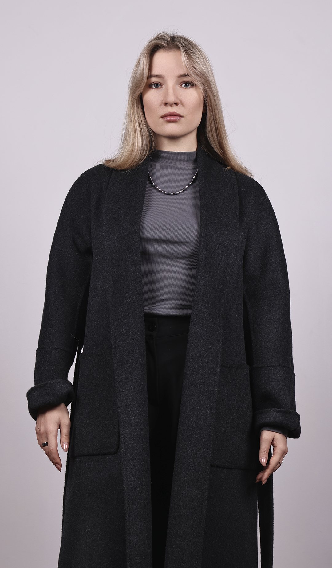 Длинное пальто из тёмной шерсти. Прямой силуэт с поясом. Лаконичный и строгий стиль.