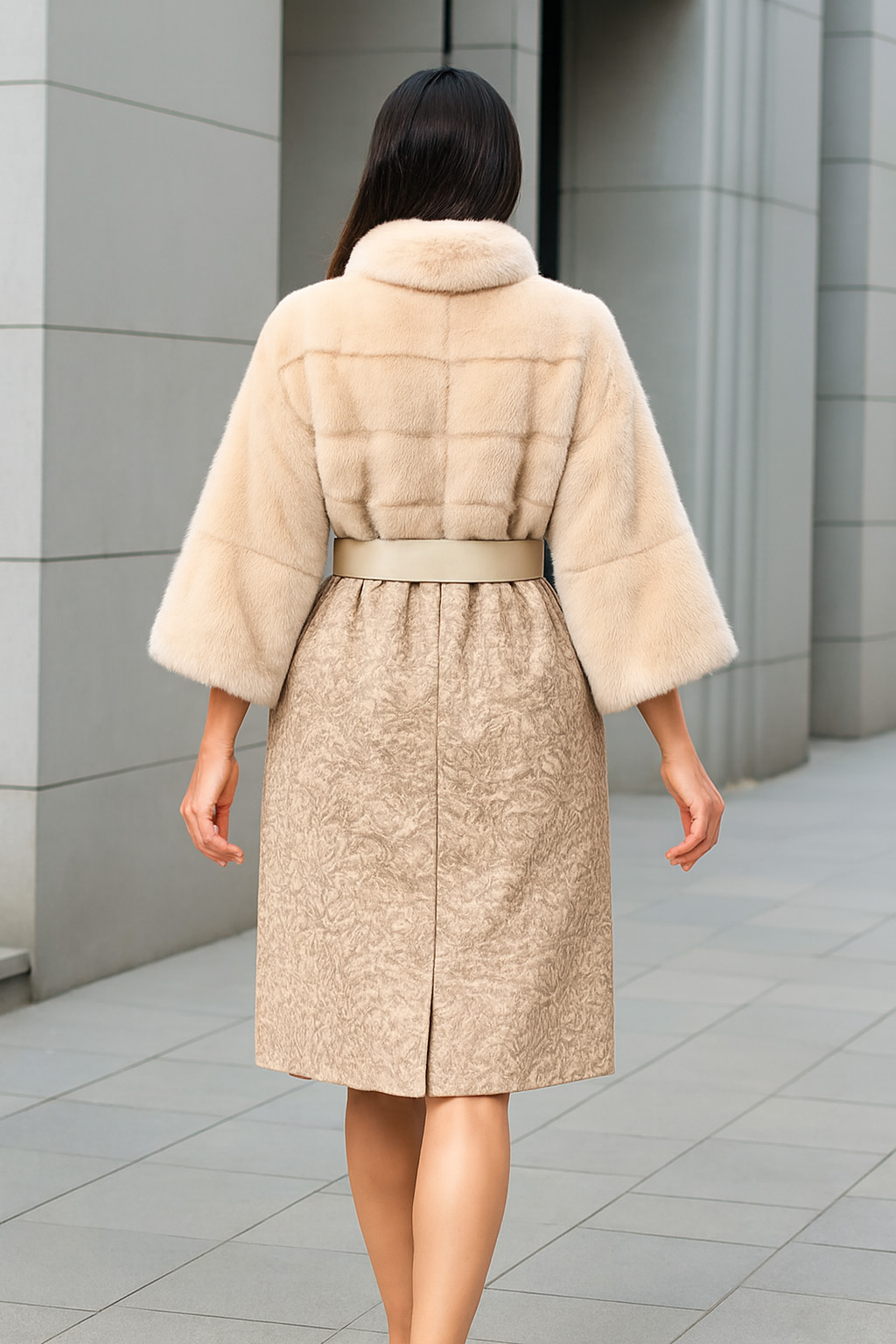 Комбинированное пальто из норки бежевого цвета с поясом. Утончённый дизайн.