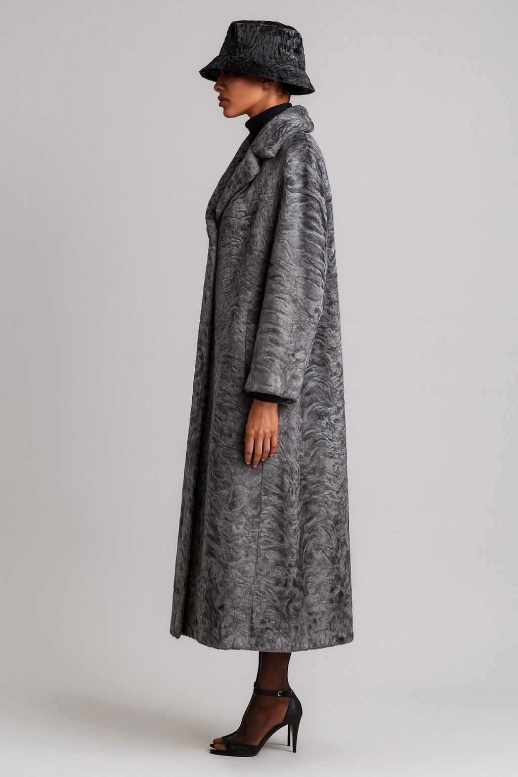 Шуба из каракуля серого цвета в стиле оверсайз. Современный силуэт, подиумный крой.