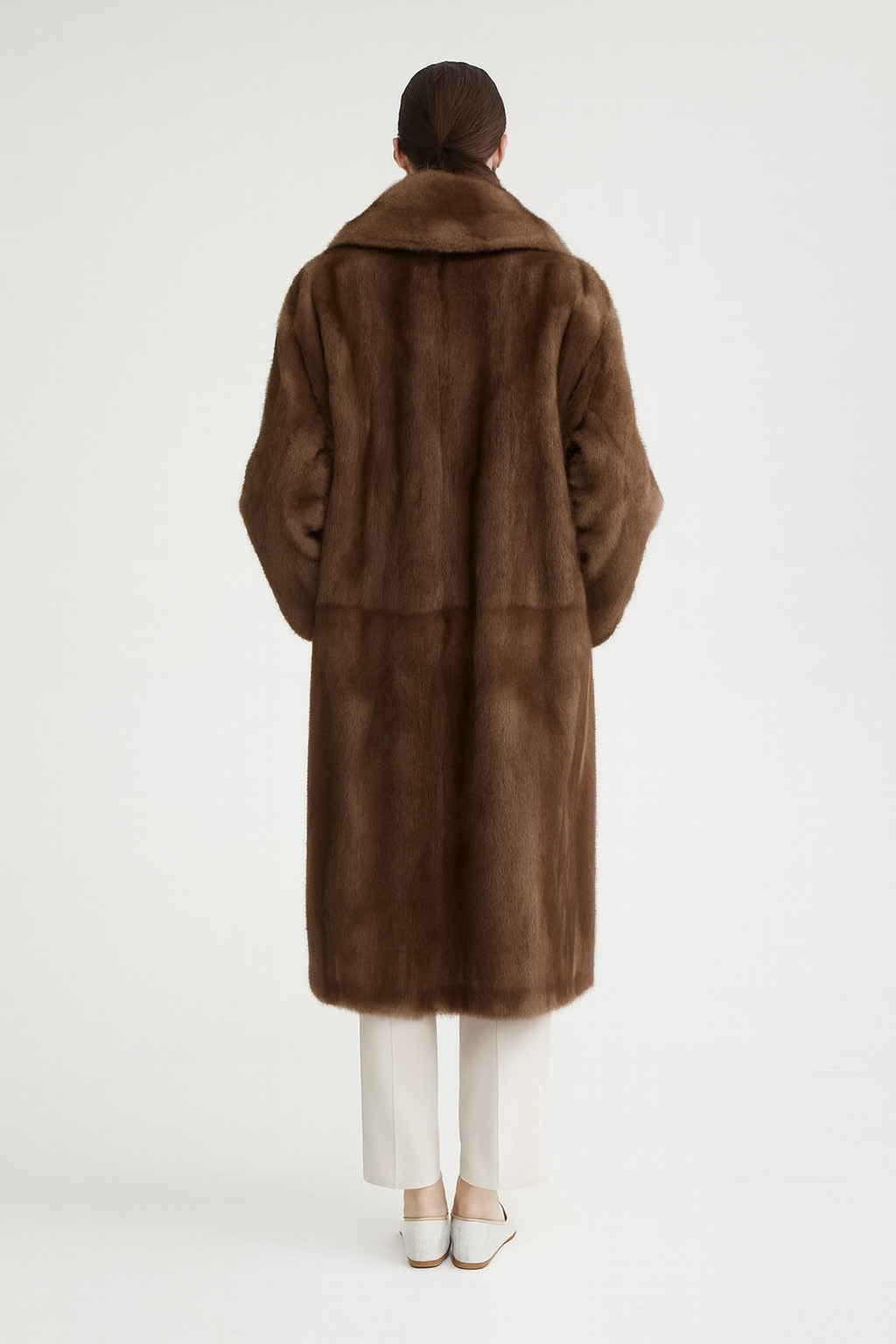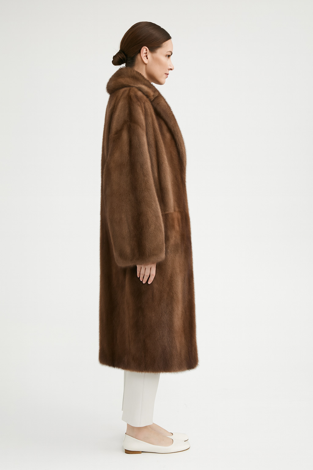 Шуба из норки коричневого цвета. Свободный длинный крой, комфорт и элегантность.