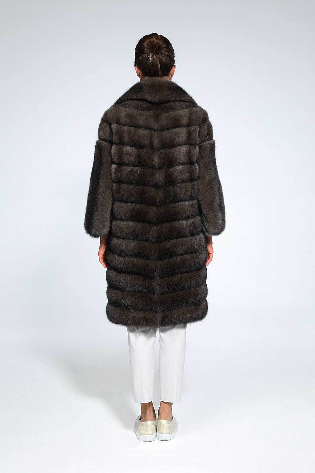 Роскошная шуба из соболя глубокого тёмно-коричневого оттенка. Длинный силуэт, безупречный мех.