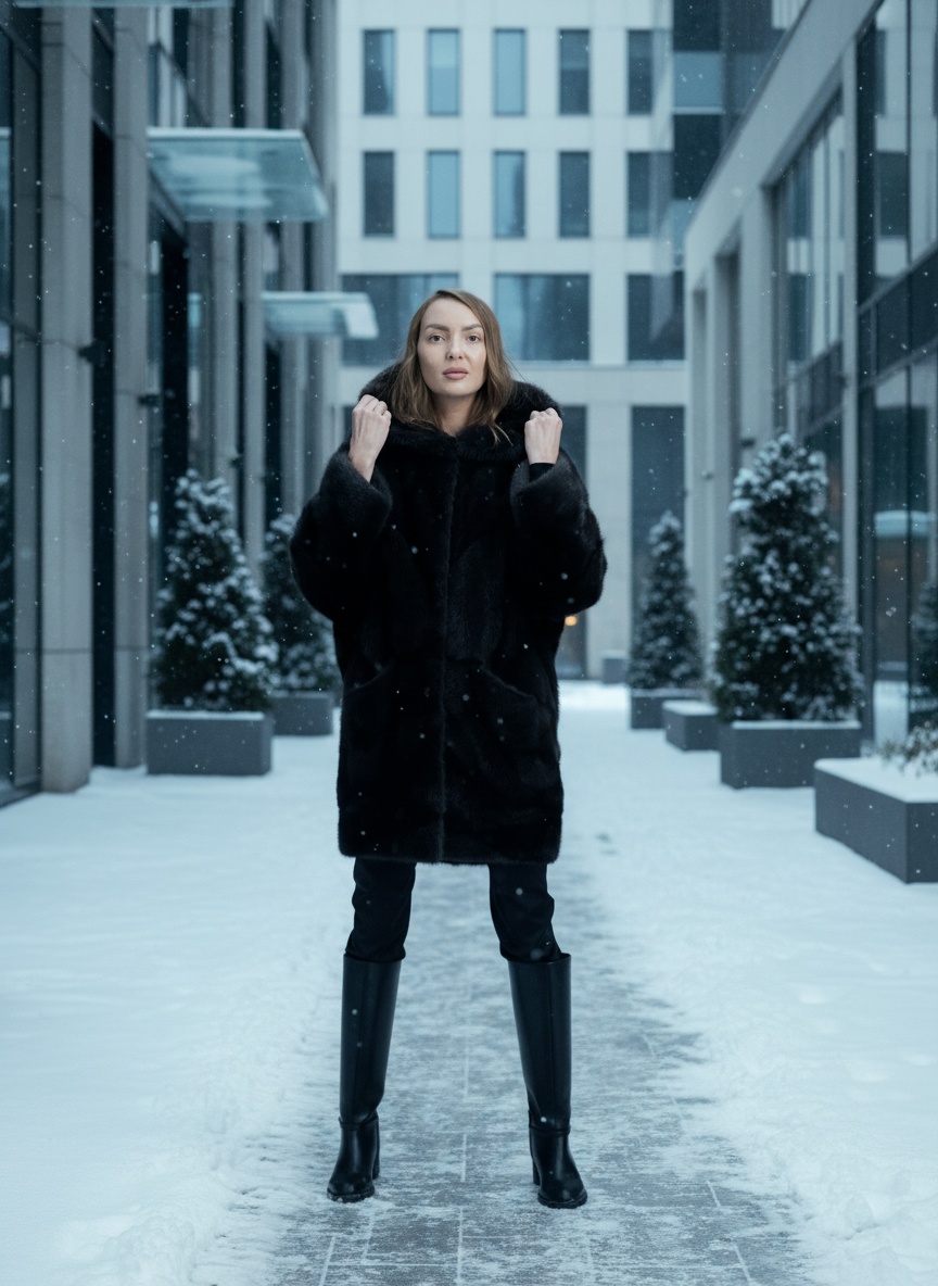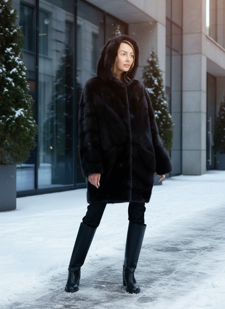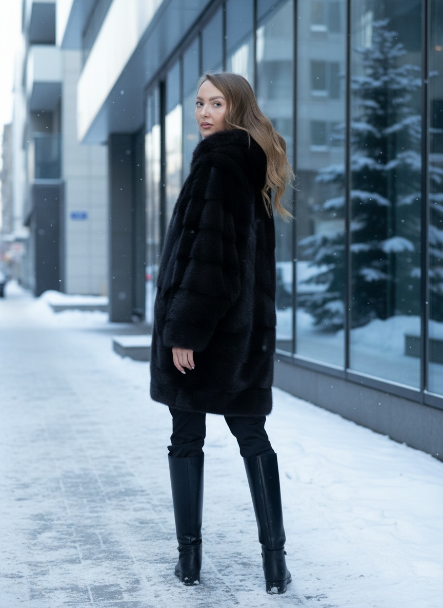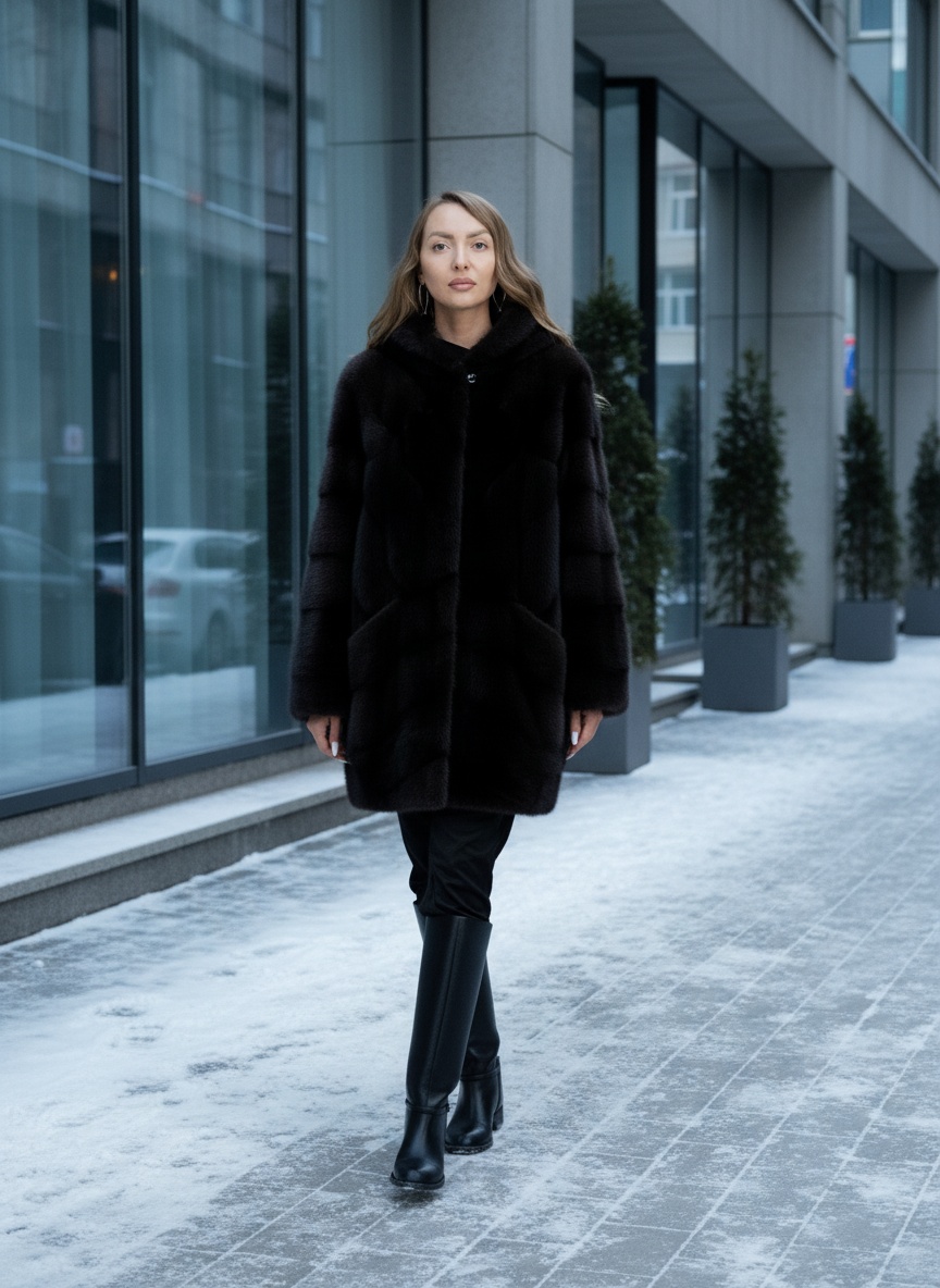 Элегантная норковая шуба с капюшоном. Тёмный соболиный оттенок, прямой удлинённый силуэт.